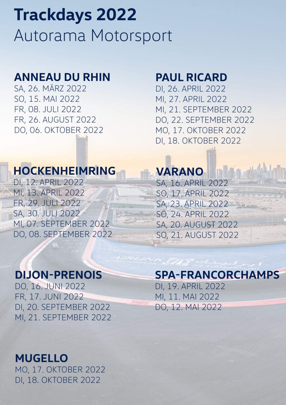 Unsere Trackdays bieten Ihnen die Möglichkeit, Ihr eigenes Fahrzeug oder eines unserer offiziellen Rennfahrzeuge auf einer Rennstrecke zu bewegen und dabei Ihr fahrerisches Können zu verbessern. Auch besteht die Möglichkeit, eine Fahrt mit dem „Renntaxi“ zu buchen. Dabei werden Sie als Beifahrer von einem unserer Rennfahrer durch den Kurs „chauffiert“.